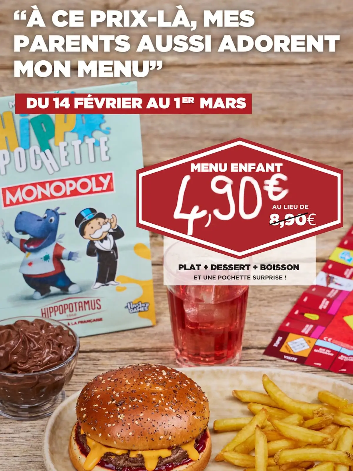 Jusqu’au 1er mars, profitez du menu enfant (plat + dessert et boisson) à 4,90 € au lieu de 8,90 €* !