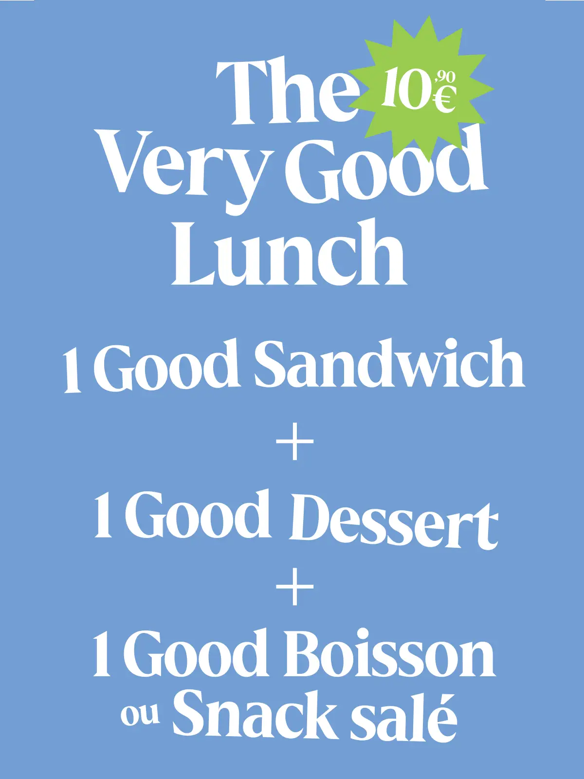 Un Lunch à composer avec vos 3 produits préférés : Sandwich + Dessert + Boisson ou Snack salé pour 10,90€.